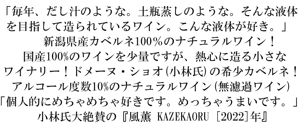 飲みやすく、飲み飽きずワインだけでも良い&料理と合わせても良い!それは、香りは優しく気持ちよく味については「ダシ感」を大切にしています!植物、果実の持つ旨味、それをダシ(出汁)と表現しています!「瑞々しい旨味」それが1人1本飲みきれるワイン!