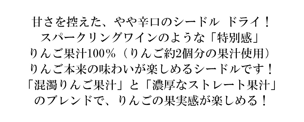 酸化防止剤(亜硫酸塩)を添加せずに、りんご果汁100%使用し、丁寧に造ったりんごのスパークリングワインです。りんご2個分の果汁を使用!すっきりとやや辛口で、りんごのフルーティな果実感が楽しめます。