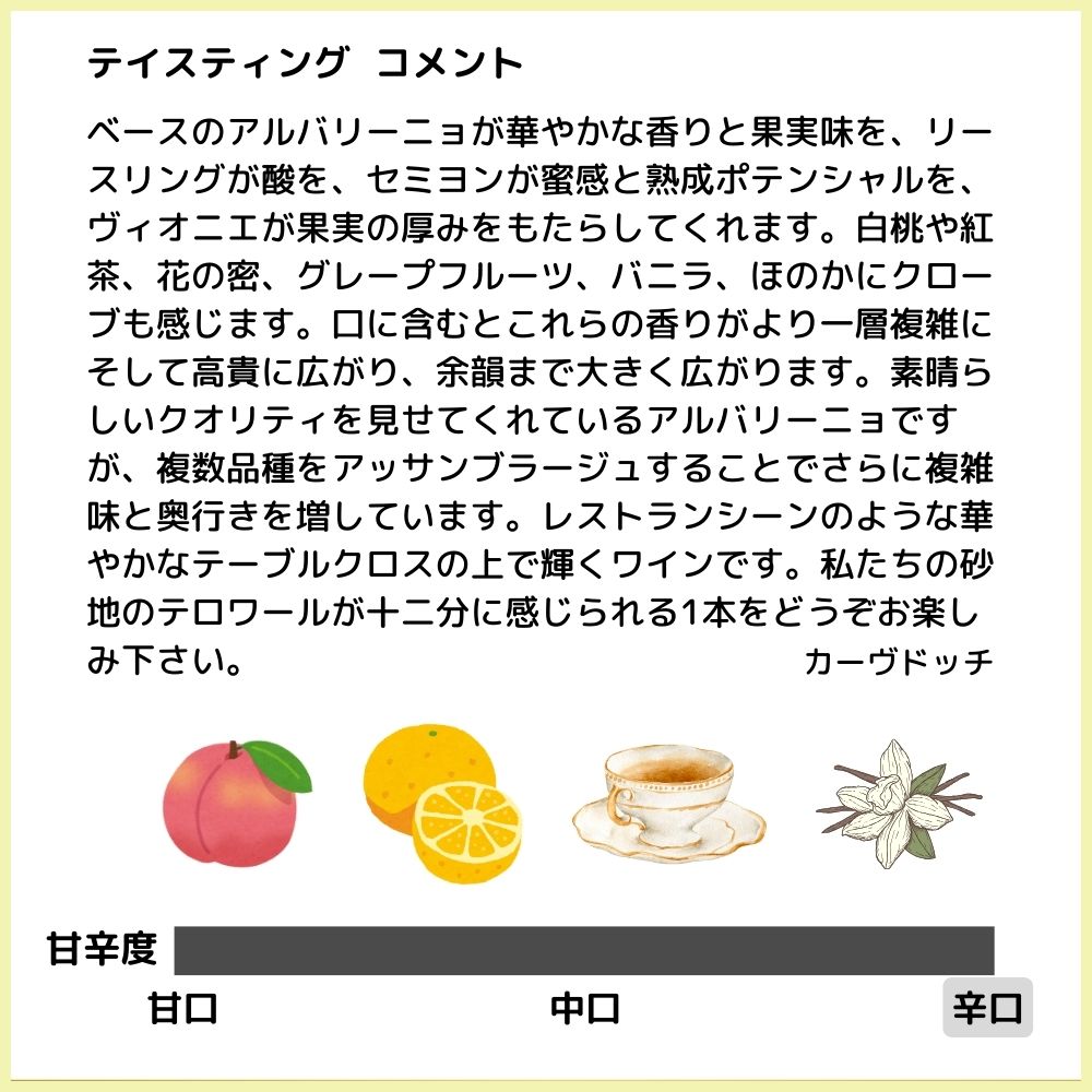 ワイナリーは「ベースのアルバリーニョが華やかな香りと果実味を、リースリングが酸を、セミヨンが蜜感と熟成ポテンシャルを、ヴィオニエが果実の厚みをもたらしてくれます。白桃や紅茶、花の密、グレープフルーツ、バニラ、ほのかにクローブも感じます。口に含むとこれらの香りがより一層複雑にそして高貴に広がり、余韻まで大きく広がります。素晴らしいクオリティを見せてくれているアルバリーニョですが、複数品種をアッサンブラージュすることでさらに複雑味と奥行きを増しています。レストランシーンのような華やかなテーブルクロスの上で輝くワインです。私たちの砂地のテロワールが十二分に感じられる1本をどうぞお楽しみ下さい。」とコメント。