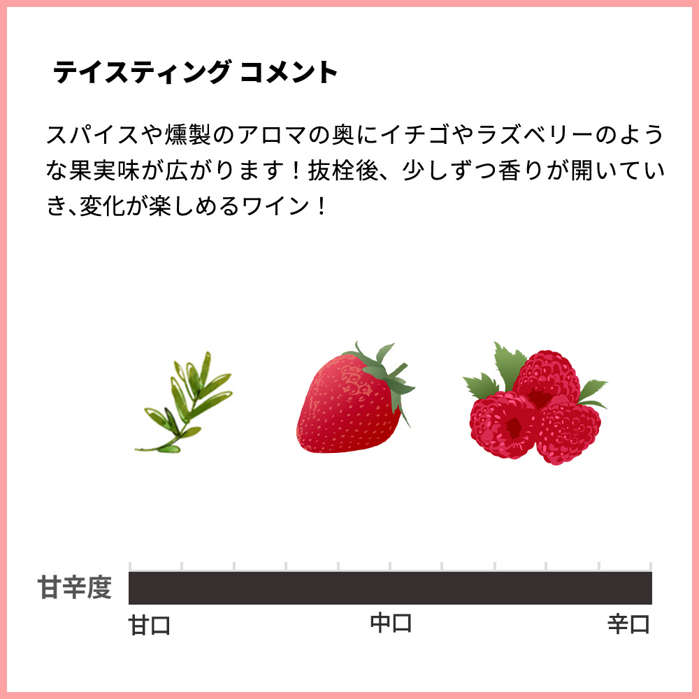 スパイスや燻製のアロマの奥にイチゴやラズベリーのような果実味が広がります!抜栓後、少しずつ香りが開いていき、変化が楽しめるワイン!
