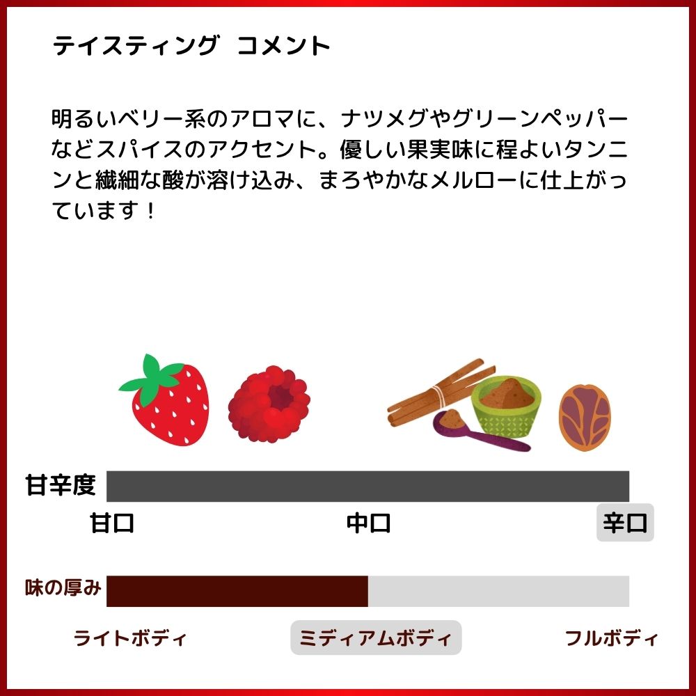 明るいベリー系のアロマに、ナツメグやグリーンペッパーなどスパイスのアクセント。優しい果実味に程よいタンニンと繊細な酸が溶け込み、まろやかなメルローに仕上がっています!