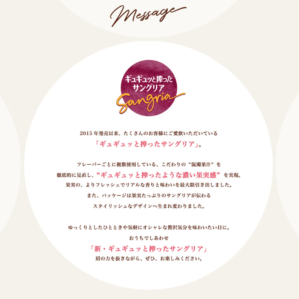 | ■商品説明 | サングリア愛好家大注目!「こだわりの果汁」「こだわりのワイン」を使用することで、果実を“ギュギュッと搾ったような”今までにないフルーティでリッチな果実感のサングリアができました!商品名の“ギュギュッと搾った”にふさわしい、みずみずしい果実のおいしさを感じていただけるよう、果実感を演出するワインのブレンドから果汁の選定、香味バランスの調整まで、とことんこだわって開発!ギュギュッと搾ったサングリア・ロゼワイン・ピーチ&マンゴー&オレンジは、ピーチとマンゴーとオレンジの、豊かな香りととろりと熟したふくよかな味わい。ワインのメルシャンならではのこだわりの「ギュギュッと搾ったサングリア」をぜひお試しください。 |