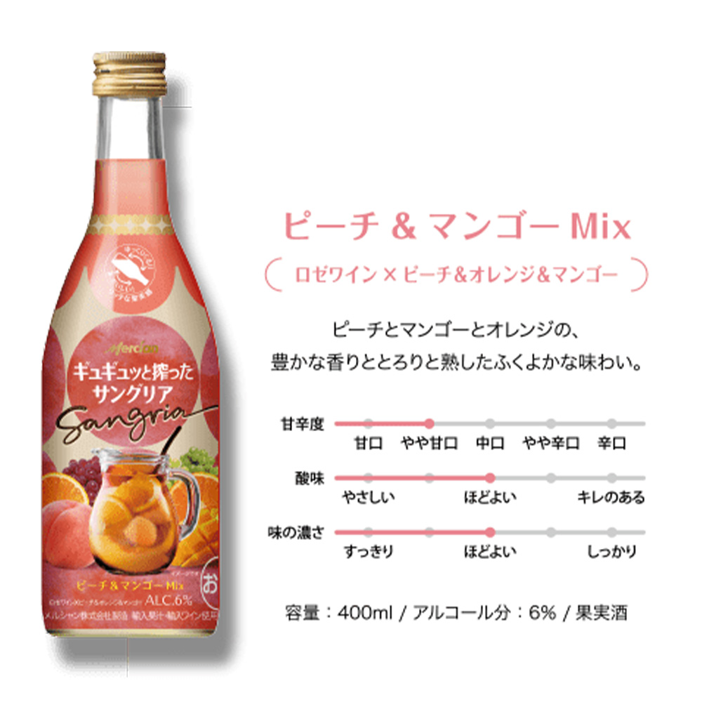| ■商品名 | 【1ケース 12本入り】ギュギュッと搾ったサングリア・ロゼワイン・ピーチ&マンゴー&オレンジ・400ml x 12・1ケース・アルコール6% |