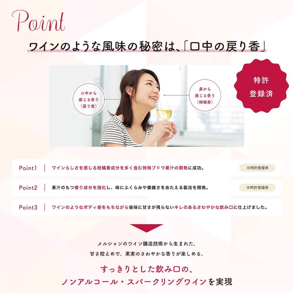 | ■商品説明 | ワイン醸造技術をいかした原料開発や、独自の製法(特許登録済み)で、スパークリングワインらしい香り豊かですっきりとした味わいが特長の、アルコール0.00%のノンアルコール・スパークリングワインです。 |