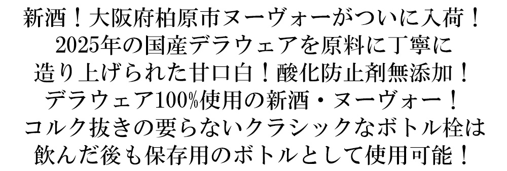 2025年の国産デラウェアを原料に丁寧に造り上げられた甘口の白ワイン!しかも酸化防止剤無添加の新酒・ヌーヴォー!