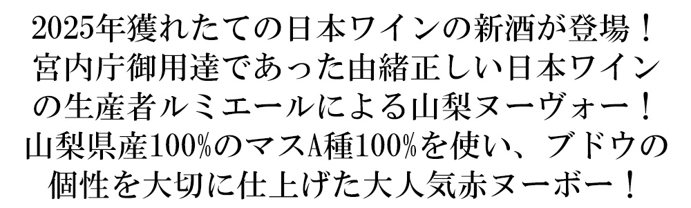 新酒 ルミエール フレール マスカットベイリーA 2025 ヌーヴォー 山梨ワイン新酒 山梨県産 株式会社ルミエール 日本ワイン 赤 辛口 ■ぶどう品種:マスカットベーリーA種100% 日本の赤ワインの代表品種マスカット・ベイリーA種100%で造られたチャーミングな赤ワインの新酒!山梨県産100%のマスカットベイリーA種100%を使い、ブドウの個性を大切に仕上げられた大人気辛口赤ヌーボー! 造り手は、宮内庁御用達であった由緒正しい日本ワイン(格式と風格あるワイン造りを続け、大正時代には宮内庁御用達となった由緒正しいワイナリー=ルミエール)の造り手が手掛ける2025年産・山梨ヌーヴォー・新酒! 山梨県産のマスカットベイリーA種100%を使い、ブドウの個性を大切に仕上げています!チキンカツ、焼き鳥(タレ味)、脂ののった白身魚などと合わせてお楽しみ下さい!