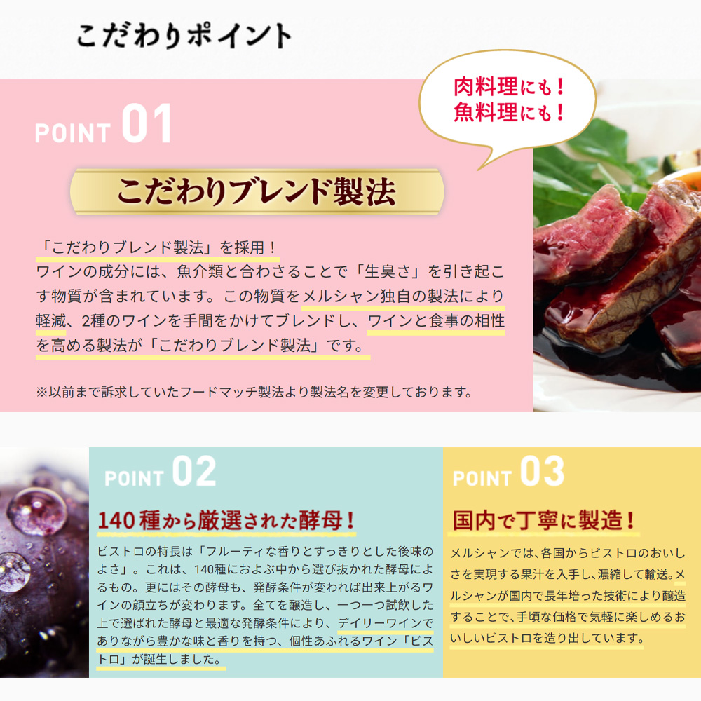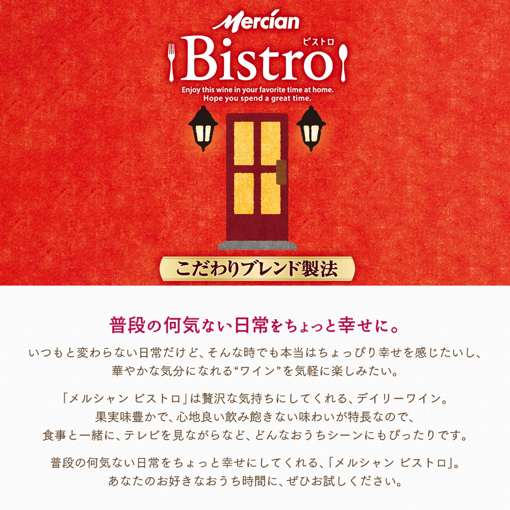 | ■商品説明 | 『ビストロ』は普段の何気ない日常をちょっと幸せにする、気軽に楽しめるデイリーワインです。華やかな香りと味わい、すっきりと心地よい後味が特長で、ワインが初めての方にもおすすめです。気軽に楽しめるお得な大容量の紙パックに入ったワインです。 |