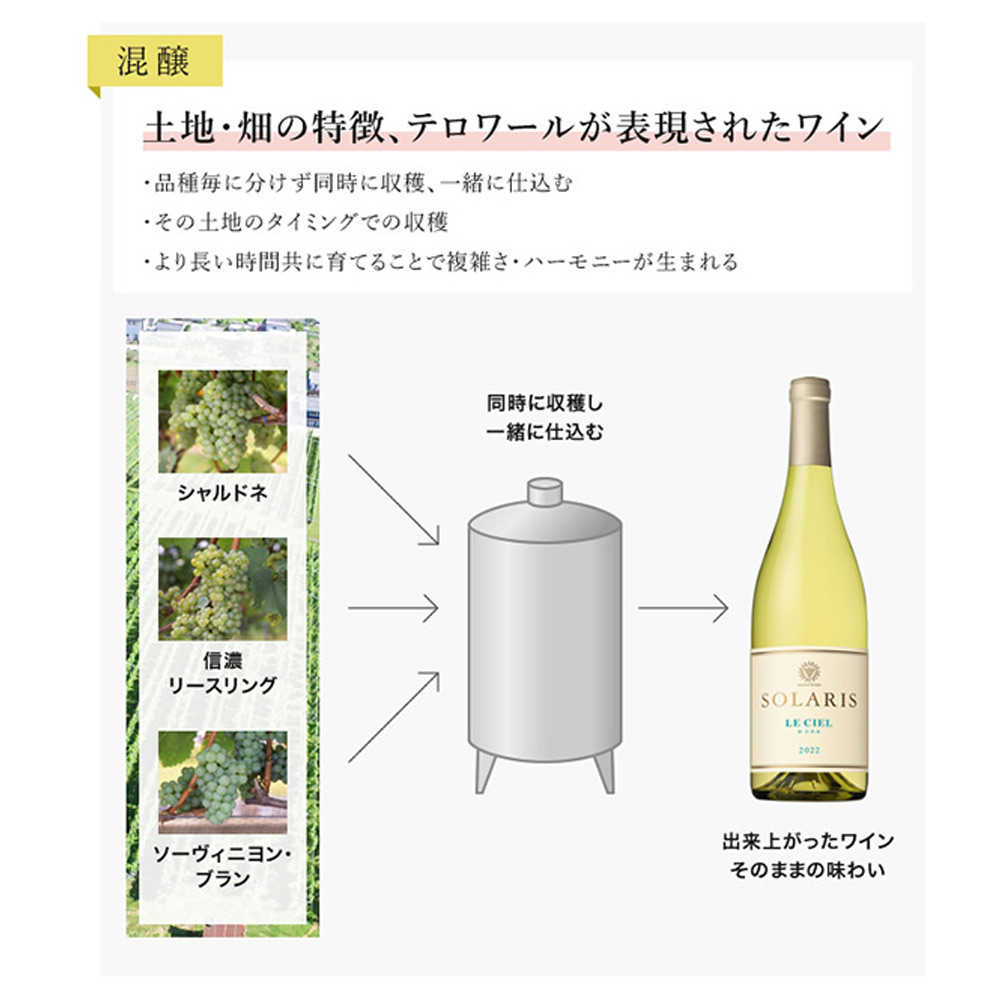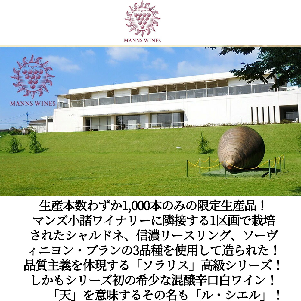 も長野県マンズ小諸ワイナリー元詰・蔵出し品で、しかもワイン愛好家のために造られるソラリス・“ル・シエル”は毎年セパージュの比率が変わる為、二度と同じセパージュのル・シエルは造られません!まさに愛好家のために造られた土地の個性や風土を生かした“テロワールワイン”醸造責任者渾身の貴重辛口白ワインが限定で少量入荷!