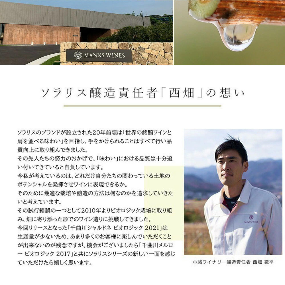 なんと!生産本数わずか1,000本のみの限定生産品!長野県産100%のマンズ小諸ワイナリーに隣接する1区画で栽培されたシャルドネ、信濃リースリング、ソーヴィニヨン・ブランの3品種を使用して造られた、品質主義を体現する「ソラリス」高級シリーズ!