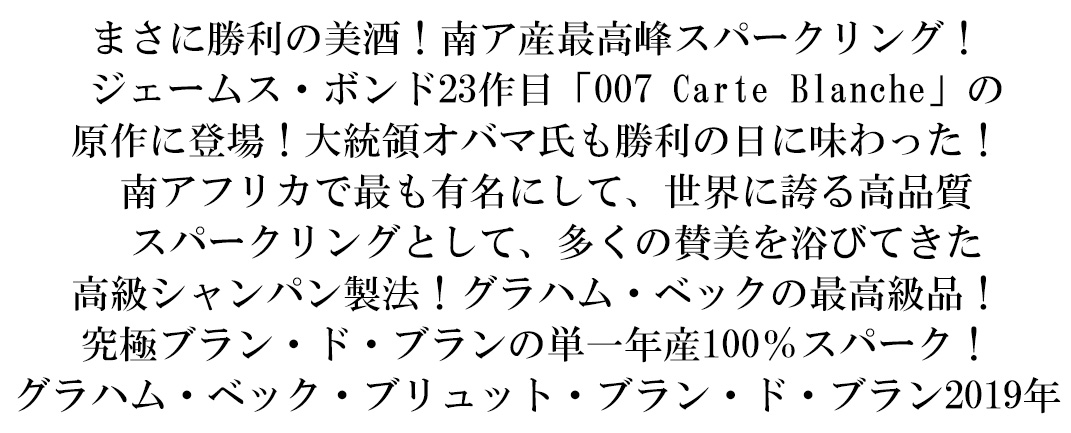 南アフリカ最高級辛口シャンパーニュ方式愛好家大注目!しかも高級ヴィンテージ入りスパークリングワイン!まさに勝利の美酒!第44代アメリカ大統領オバマ氏が歴史的勝利の日に味わったと言われる南ア産最高峰スパークリングワイン!NIKKEIプラス1の何でもランキング「夏を潤すスパークリングワイン」でグラハムベック上位ランクのブラン・ド・ブランが堂々の第一位!なんとジェームス・ボンドの23作目となる「007 Carte Blanche」の原作に登場!ボンドがエンディングでボンドガールのために用意したとっておきのスパークリングワイン!南アフリカで最も有名にして、世界に誇る高品質スパークリングワインとして、多くの賛美を浴びてきたグラハム・ベック!良質なピノ・ノワールとシャルドネの産地として有名な産地に農場を購入、1991年より生産をスタートさせました。(蔵の始まりは1983年に創始者であるグラハム・ベック氏がピノ・ノワールとシャルドネに適した石灰質土壌が広がるロバートソンのマディバ農園を購入したことに始まります。1990年には同敷地内にワイナリーを建設し、瓶内二次醗酵ワインのスペシャリストである醸造家のピーター・フェレイラ氏を迎え1991年よりワイン造りを開始)!南アフリカ産スパークリングとして、初リリースから毎年高い評価を獲得!南アフリカで最も多くの賞を受賞してきた生産者として知られています!恵まれた日照量が育む奥深い複雑味と果実味、それであってフレッシュさが際立った瓶内二次醗酵による高級スパークリングワイン!また、醸造家ピーターの身体を流れる血は「泡」で出来ている、とワイン関係者が語るほどスパークリングワインの生産を天職にしてきた南アフリカを代表する泡の重鎮的存在!ずばりグラハム・ベックによるブルゴーニュ品種の産地として有名なW.O.ロバートソンの素晴らしいテロワール(赤い頁岩と砂岩質のカルー土壌の上に肥沃な石灰質土壌が広がる)から、手摘み100%のブラン・ド・ブラン(シャルドネ100%)で、しかも南アが世界に誇る二次醗酵のカップ・クラシック方式!50%シャンパーニュ樽(205L、新樽比率5%)&50%ステンレスタンク醗酵後5ヶ月熟成!MLF無し!瓶内二次醗酵期間驚異の50ヶ月でリリースされる単一年産100%の究極ブラン・ド・ブラン!濃厚で心地よいイースト香が濃く、ほのかにライムやミネラルの爽やかなノーズ!刺激的でキメ細やかなムース状の、弾けるクリーミーな泡!エレガントなフィニッシュのシャンパンもビックリ!瓶熟なんと4年2ヶ月!の究極ヴィンテージ辛口スパークリングが少量で限定入荷!