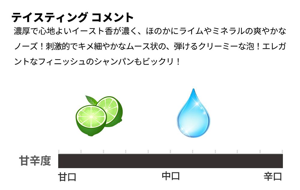 濃厚で心地よいイースト香が濃く、ほのかにライムやミネラルの爽やかなノーズ!刺激的でキメ細やかなムース状の、弾けるクリーミーな泡!エレガントなフィニッシュのシャンパンもビックリ!