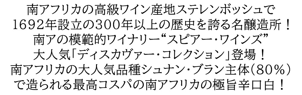 スピアー・ワインズ・ディスカヴァー・コレクション・ピノ・タージュ・シラーズ[2023]年・スピアー・ワインズ元詰・W.O.ウエスタン・ケープ ■ぶどう品種:シュナン・ブラン種80%主体、シャルドネ種20%■発酵・熟成:ステンレスタンク発酵、ステンレスタンクでシュールリーで最低2ヶ月熟成 南アフリカ・ウエスタン・ケープ、高級ワイン産地ステレンボッシュで1692年設立の300年以上の歴史を誇る醸造所!ミクロクリマの多い南アフリカの魅力を最大限に生かし、品種にあわせ栽培地を選択! また社会的責任を果たそうとする姿勢が随所に見られ、品質の高さから高評価を獲得する、まさに南アフリカの模範的ワイナリー!“スピアー・ワインズ”からエントリーシリーズの「ディスカヴァー・コレクション」登場!ワイナリーとしては2018年にIWC(インター・ナショナル・ワイン・アンド・スピリッツ)で南アフリカの最優秀生産者に贈られる「プロデューサー・オブ・ザ・イヤー」を受賞、2021年には南アフリカワイン評価誌「プラッターズ」エディターズ・アワードにて最優秀ワイナリー賞を受賞!
