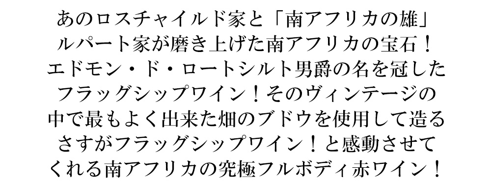 濃いルビー色、プラムやチェリー、ほのかなブラックチョコレート、煎ったコーヒー、モカのフレーバーの本格派フルボディ辛口赤ワイン!このワインの[2019]年でティム・アトキン驚異95点!パーカポイント驚異96点の高評価!さすがフラッグシップワインと感動させてくれる究極の味わい!(ラムや牛のフィレや脂身の少ない肉料理との相性がすばらしい)究極南アフリカ・フルボディ辛口赤ワインが正規品の蔵出しで限定少量入荷!