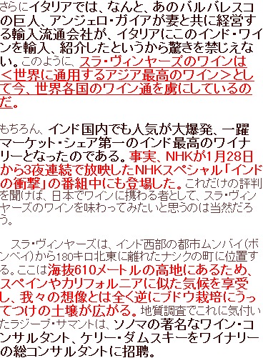 また、フランス最高のワイン・ショップで、ワイン・マニアに絶大な人気を誇るパリのカリスマ・ワイン・ショップ<ラヴィニア>が、今、大々的にプロモーションしているのがこのスラ・ヴィンヤーズのインド・ワイン。加えて、あの『ルヴュ・デュ・ヴァン・ド・フランス』までが、何度も誌面に掲載し、高く評価しているのである。