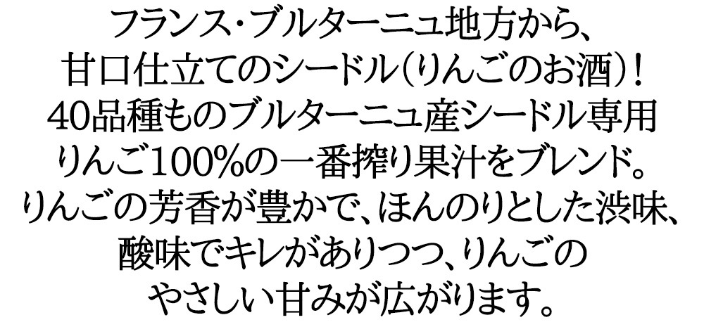 シードル・ヴァル・ド・ランス/ クリュ・ブルトン ドゥ・(甘口) 40品種ものブルターニュ産シードル専用りんご100%の一番搾り果汁をブレンド。ほんのりとした渋味、酸味でキレがありつつ、りんごのやさしい甘みが広がります。度数も低く(2%)、多くの方に。シードルはワインよりもアルコール度数が少なく、またポリフェノールを多く含み、ビタミン、ミネラル類、アミノ酸が豊富なヘルシー志向の飲み物です。ポリフェノールを多く含む皮部分が厚い、シードル専用りんごです。 使用のリンゴも甘味、酸味、辛味、渋味などそれぞれ豊かな滋味を持つ40種類以上のりんごを厳選しブレンドしています。私たちが普段食べる食用りんごと比較すると、皮の厚いシードル専用りんごはポリフェノールが5倍以上含まれています。すっきりとした口当たりのシードルは、どんな料理にも合います。魚介料理には辛さが特徴のシードルを、コクが豊かなシードルには肉料理、またそれぞれの料理に合うシードルの繊細な味や香りを探し選ぶことも奥深い楽しみです。この甘口のクリュ ブルトン ドゥ〈甘口〉は度数も低く(2%)、40品種ものブルターニュ産シードル専用りんご100%の一番搾り果汁をブレンド。ほんのりとした渋味、酸味でキレがありつつ、りんごのやさしい甘みが広がります。