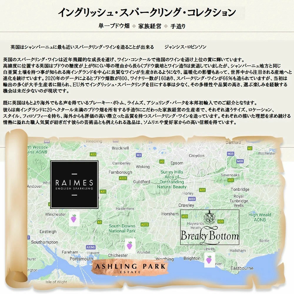 ブレイキー・ボトム・キュヴェ・デヴィッド・ピアソン・ブリュット[2015]年 ■葡萄品種:シャルドネ70%/ピノ・ノワール15%/ピノ・ムニエ15% ■年産:6,004本 ■樹齢:20~46年 ■土壌:石灰岩/ローム ■残糖:9.3g/L ■熟成:4年間 英国産高級シャンパーニュ瓶内二次方式(高級メソッド・トラディショナル)! あのMWジャンシス・ロビンソン氏に「英国はシャンパーニュに最も近いスパークリングワインを造ることが出来る。」と大注目! ブレーキー・ボトムは家族経営の生産者で、デゴルジュマンを除く全ての工程を自分で行っています! ブレーキー・ボトムはヴィンテージのそれぞれのワインに名前がついています!友人やおじいさんの名前、有名人や古いガール・フレンドの名前であったりしますが、特にこだわりは無く思いつくままに付けているそうですが、それぞれのストーリーや隠された意味を深読みしてしまいます。 単一年産のミレジメ[2015]年もの!まさに高級シャンパーニュ匹敵の究極英国スパークリングワインが超限定で極少量入荷!