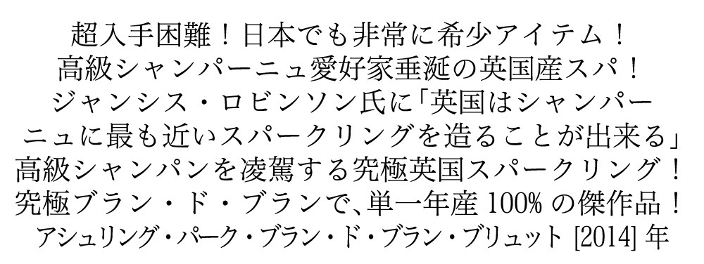 アシュリング・パーク・ブラン・ド・ブラン・ブリュット[2014]年 ■ぶどう品種:シャルドネ100% ■発酵・熟成:4年間熟成 あのMWジャンシス・ロビンソン氏に「英国はシャンパーニュに最も近いスパークリングワインを造ることが出来る。」と大注目! 造り手のアシュリング・パークは10.8haのブドウ畑を所有する2017年に設立されたエステート! その内9.2haは2009年に植樹されており、発起人であるゲイル・ガードナーの家族のみで構成されたまさに家族経営の生産者! ワイン醸造を手掛けるのは伝説のワインメーカーといわれるダーモット・シュグルーで彼は英国のワインメーカーのシンボルとなっています! 超入手困難!日本市場でもまず味わえない!高級シャンパーニュをこの機会に是非、ご賞味ください!