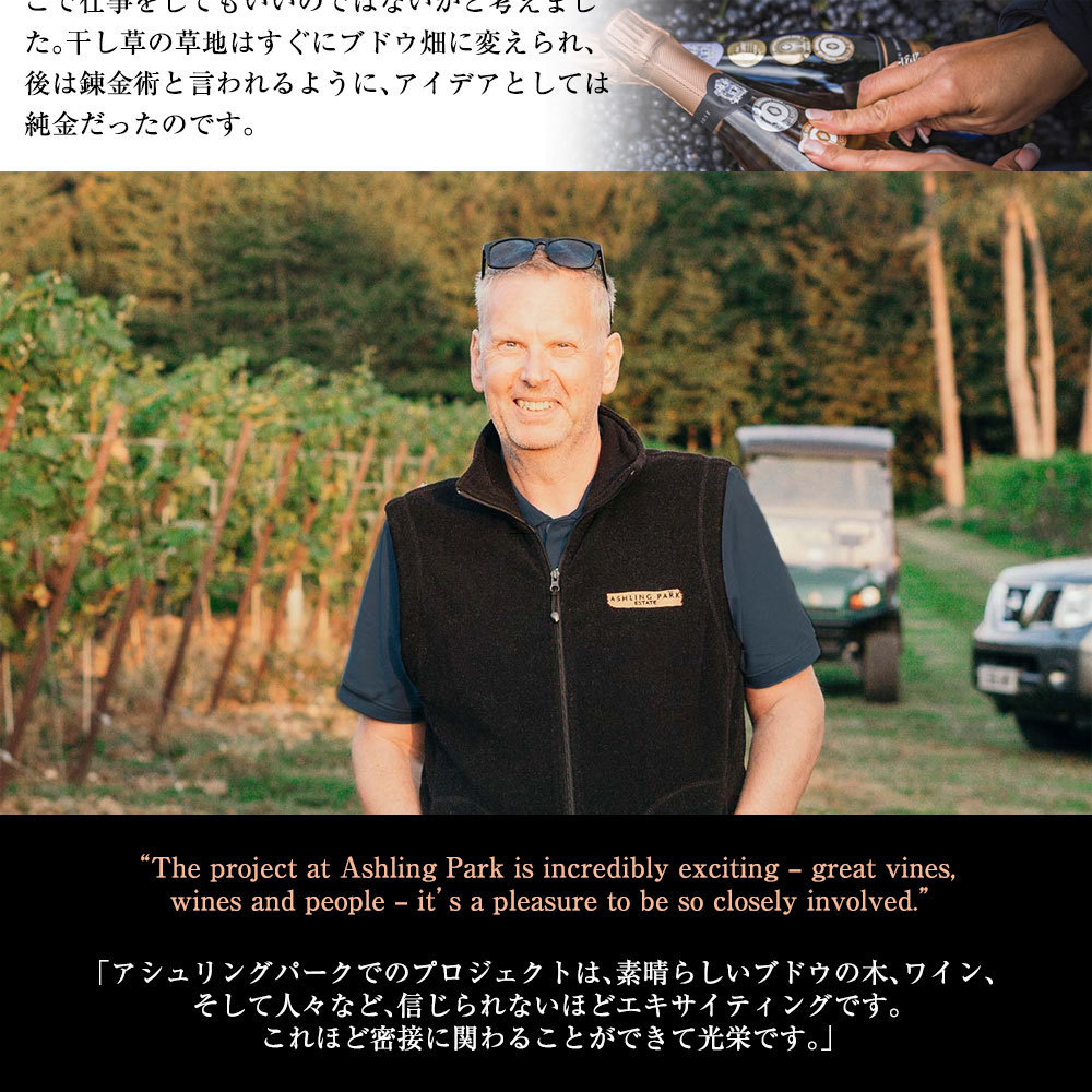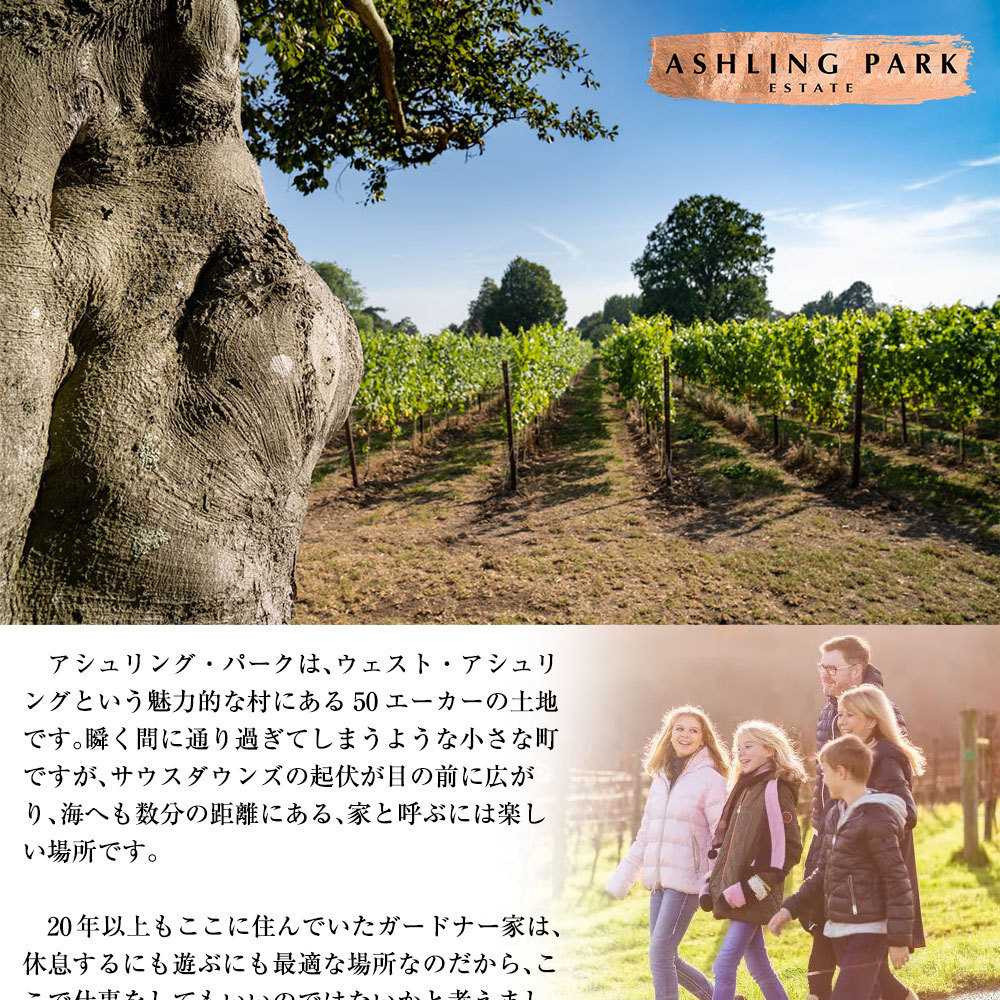 10.8ヘクタールのブドウ畑を所有するアシュリング・パークは2017年に設立されました。そのうち9.2ヘクタールは2009年に植えられたものです。発起人であるゲイル・ガードナーの家族のみで構成された正に家族経営の生産者です。ワイン醸造を手掛けるのは伝説のワイン・メーカーと言われるダーモット・シュグルーで彼は英国のワイン・メーカーのシンボルとなっています。現在は、スパークリング・ワイン造りに注力していますが、将来的にはスティル・ワインを造ることも視野に入れています。