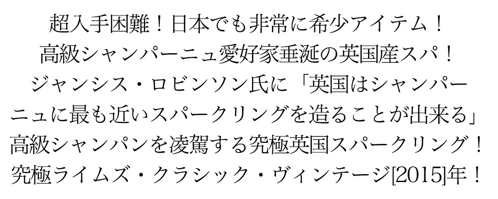 ライムズ クラシック ヴィンテージ 2015 ■ぶどう品種:シャルドネ55%/ピノ・ムニエ28%/ピノ・ノワール17% 手摘み100% ■発酵・熟成:42ヶ月熟成/高級シャンパン2次発酵方式 あのMWジャンシス・ロビンソン氏に「英国はシャンパーニュに最も近いスパークリングワインを造ることが出来る。」と大注目! ライムズ・クラシック・ヴィンテージ2014ではデキャンタ誌(2019年11月号)の「今試すべきイングリッシュワイントップ30本」に選出!このライムズ・クラシック・ヴィンテージ[2015]年は、パンプシャーの4haの石灰質、ローム土壌からの減農薬栽培のシャルドネ55%にピノ・ムニエ28%、ピノ・ノワール17%というシャンパーニュブレンド(手摘み100%)!20%樽発酵、60%マロ発酵、驚異の42ヶ月間熟成!残糖7g/Lの辛口仕上げ! しかも単一年産のミレジメ[2015]年もの!まさに高級シャンパーニュを凌駕した味わいの究極英国スパークリングワイン!