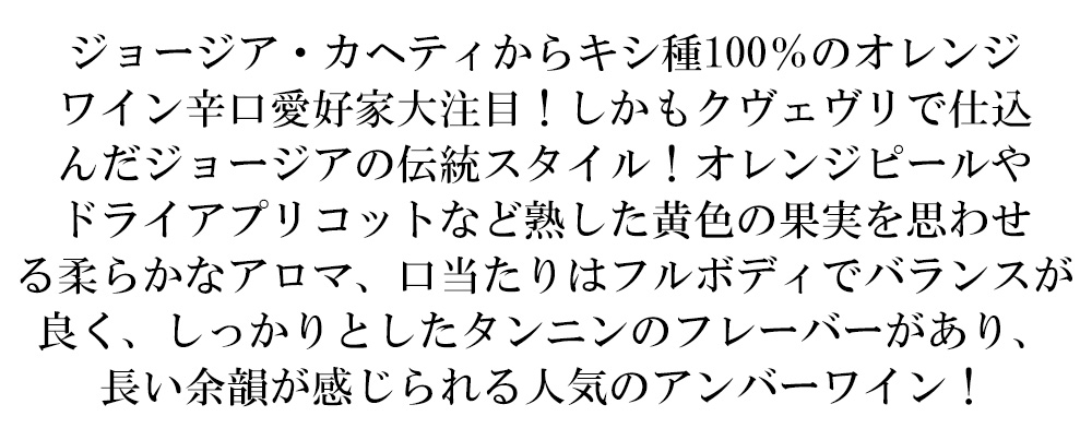 クヴェヴリで仕込んだジョージアの伝統スタイル!ドライフルーツのフレーバーやバランスの良い果実味ほのかに感じる心地よいタンニンの個性溢れる人気のアンバーワイン(オレンジワイン)!が限定少量入荷!