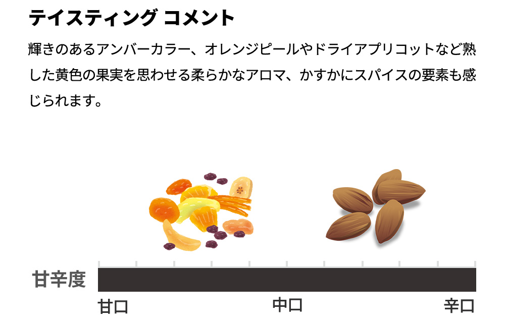 輝きのあるアンバーカラー、オレンジピールやドライアプリコットなど熟した黄色の果実を思わせる柔らかなアロマ、かすかにスパイスの要素も感じられます。