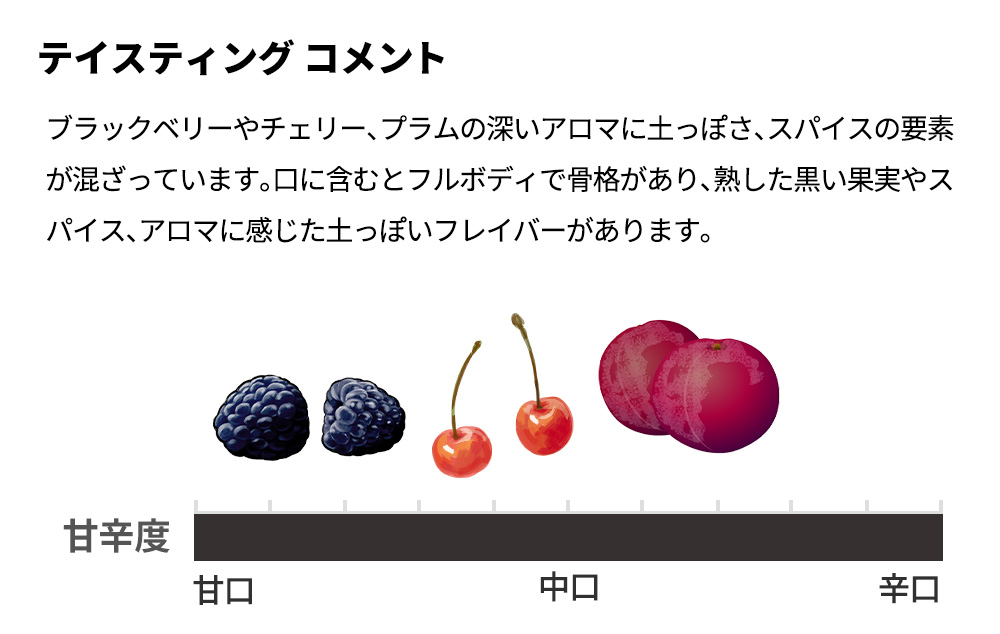 紫を帯びたルビーレッド、ブラックベリーやチェリー、プラムの深いアロマに土っぽさ、スパイスの要素が混ざっています。口に含むとフルボディで骨格があり、熟した黒い果実やスパイス、アロマに感じた土っぽいフレイバーがあります。よくこなれたタンニン、長い余韻と調和のとれた酸が感じられます。もちろん正規品の素晴らしい状態で限定入荷!