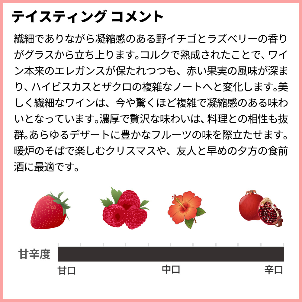活き活きとした赤い果実と、華やかなバラやハイビスカスのアロマが弾けるこのロゼは、クリーミーな質感と繊細な泡が特徴!味わいは、豊潤で熟した夏の木イチゴ、ラズベリー、カシスが感じられます!