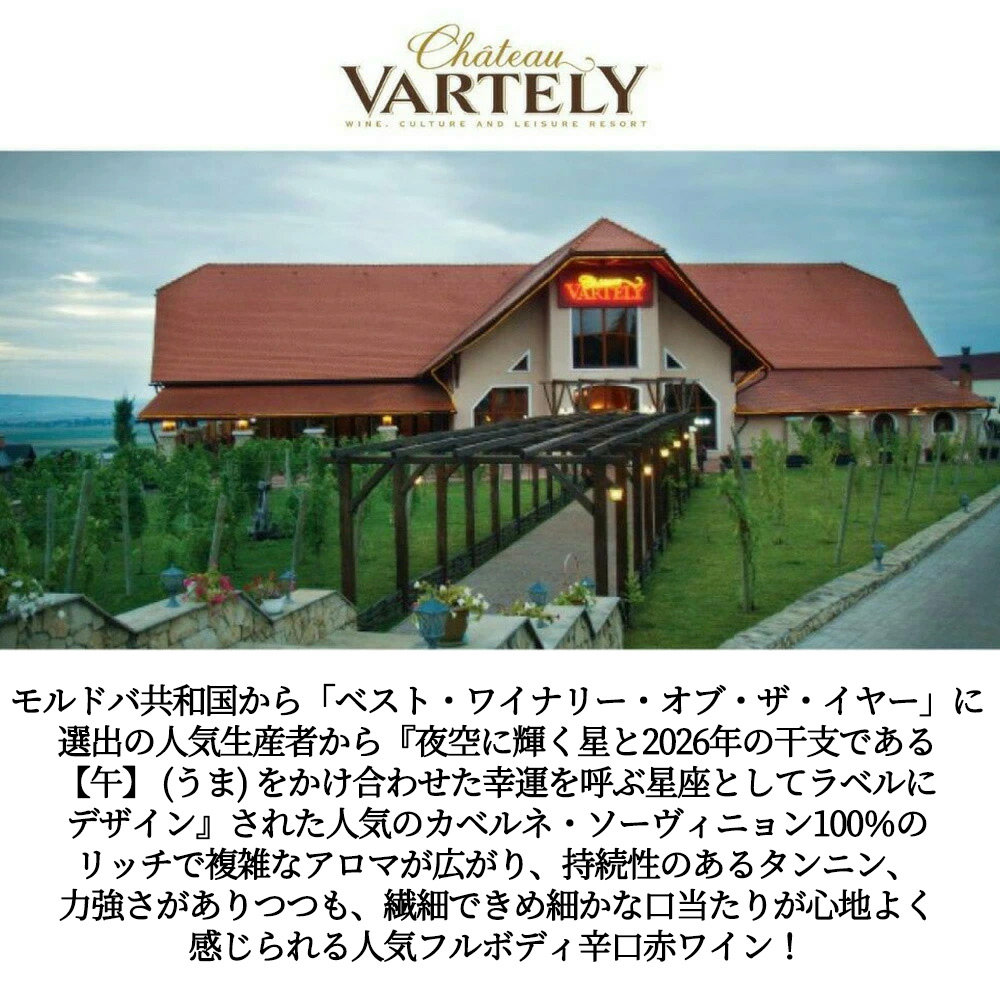 モルドバ共和国から「Wine of Moldova」の「ベスト・ワイナリー・オブ・ザ・イヤー」に選出の人気生産者から『夜空に輝く星と2026年の干支である【午】 (うま) をかけ合わせた幸運を呼ぶ星座としてラベルにデザイン』された人気のカベルネ・ソーヴィニョン100%のリッチで複雑なアロマが広がり、持続性のあるタンニン、力強さがありつつも、繊細できめ細かな口当たりが心地よく感じられる人気フルボディ辛口赤ワイン!
