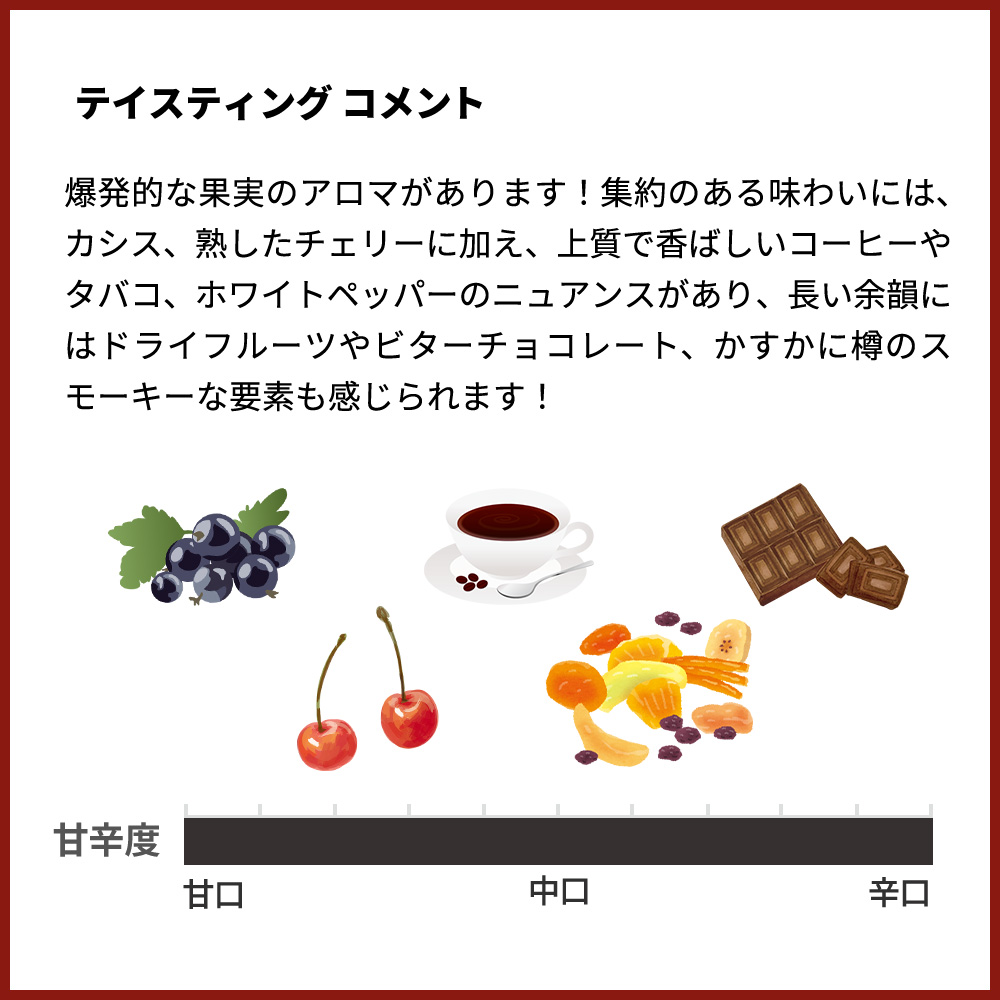 爆発的な果実のアロマがあります!集約のある味わいには、カシス、熟したチェリーに加え、上質で香ばしいコーヒーやタバコ、ホワイトペッパーのニュアンスがあり、長い余韻にはドライフルーツやビターチョコレート、かすかに樽のスモーキーな要素も感じられます!完璧に熟した最高品質の葡萄だけ使用しています!熟した果実味と新樽での熟成による甘く柔らかいオークの要素がバランス良く調和しています!