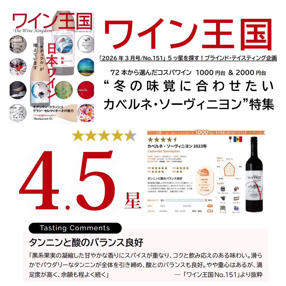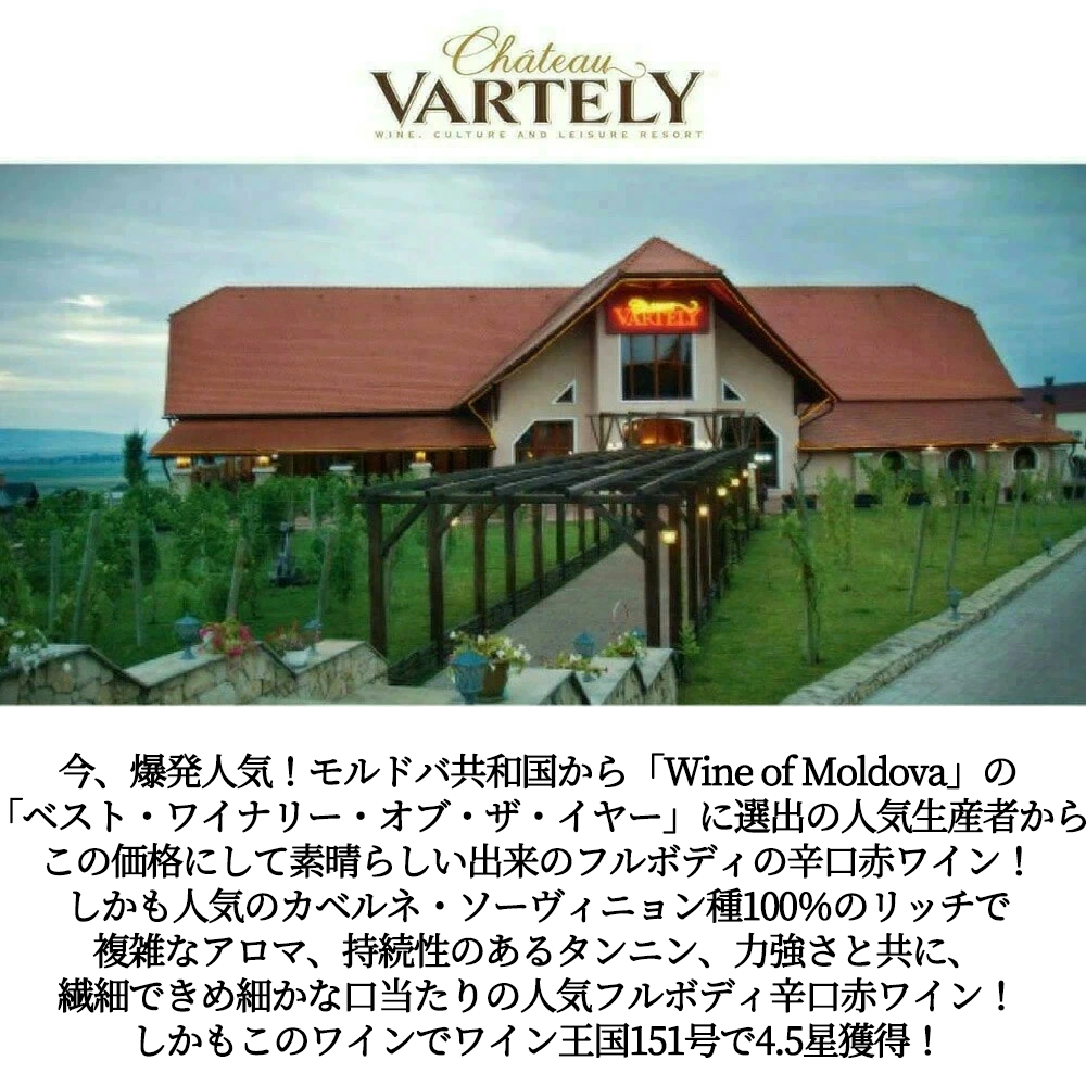 しかも造り手のシャトー・ヴァルテリーは「Wine of Moldova」の「ベスト・ワイナリー・オブ・ザ・イヤー」に選出!“モルドバの首都キシナウから北に44km離れたオルヘイに位置するワイナリーです!「ヴァルテリー」はオルヘイの町の名前に由来しており、ハンガリー語で「要塞のある場所」と言う意味があります!設立は1996年ですが、「シャトー・ヴァルテリー」としてスタートしたのは2004年!現在、合計520haの自家畑を所有しており、すべてのワインを自家畑の葡萄で造っています!品質を重視したワイン造りのおかげで、短い間に急成長を遂げ、「デカンター・ワールド・ワイン・アワード」、「ムンドゥス・ヴィニ」、「モンディアル・ド・ブリュッセル」など国際的なコンクールで数多くの賞を受賞しています!シャトー ヴァルテリーのオーナーであるヴァレリウ・ミハルツァは次のように述べています!「我々にとってこの名誉ある賞を受賞し、年間最優秀ワイナリーとして認められたことは大変光栄なことです。これは、真に傑出したワインを造るために真摯に取り組んだ我々のチーム全員の努力の結果です。私たちはワイン造りの多くの分野でパイオニアとなることを目指し、ワイン造りとワインツーリズムの両方に常に革新的な発展をもたらしてきました。この受賞は私たちの会社にとって当然の成果であり、我々がやってきたことの方向性が正しかったことを証明しています」とコメント!