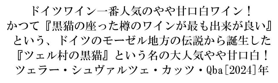 おしゃれなロイヤルブルーボトルのツェラー・シュヴァルツェ・カッツ・QbAはソフトな口当たりとすがすがしい香りで、ビギナーから飲み慣れた方まで幅広くお楽しみいただけます!モーゼル河下流域のツェル村の粘板岩の畑からリースリング種、ミュラートゥルガウ種、ケルナー種から生まれたこのワインは果実の持つ自然な甘さとキリッとした酸味が特徴で、フルーティな味わいが多くの人に愛されています!