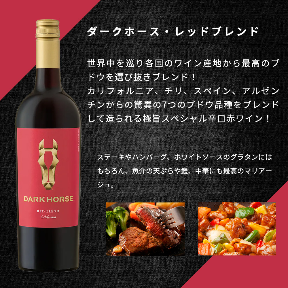 ■ワインについて 驚異の7種のブドウ品種を使用したハイコスパワイン!今、全米で爆発ヒット(アメリカで発売後、僅か1年で100万ケースを販売)の超人気フルボディ赤ワイン!驚きの「濃い旨ワイン」!その名も“ダークホース”(濃い=ダーク、旨=ホース)!ダークホースの意味は、穴馬として知られていますが、「あまり知られていないが、競争に勝って周りを驚かせる人」「自分についてあまり周りに語らないが、驚くべき資質や能力を持っている人」という意味もあります。独創的な発想により造られた「濃く」て「旨い」高品質なワインを一人でも多くの方に楽しんでもらいたい一心で「ワイン界のダークホース」が誕生!カリフォルニアの名門ワイナリー「E.&J.ガロ ワイナリー」のプレミアムワイン!“新しい手法で、ワイン業界の常識に捉われることなく挑戦したい”“これからも常識破りで予想外なことに挑戦し続ける”をポリシーとする今、大注目の女性ワインメーカー、ベス・リストン氏による従来のワインの規格(アペラシオン)を超えた創造性溢れるワイン!「ダークホース・レッド・ブレンド」は、世界中をめぐり各国のワイン産地から最高のブドウを選び抜きブレンド!カリフォルニア、チリ、スペイン、アルゼンチンからの驚異の7つのブドウ品種(カベルネ・ソーヴィニヨン、マルベック、テンプラニーリョ、シラー、メルロー、プティ・ヴェルド、ジンファンデル)をブレンドして造られる極旨スペシャル辛口赤ワイン!ビターチョコレートやバニラ!シナモン、コーヒーのアロマ!凝縮したカシスジャムやベリー系の果実味と口中に広がるフレッシュ感を併せ持つ、濃厚で豊かなコクを楽しめる究極フルボディ赤ワイン!ステーキやハンバーグ、ホワイトソースのグラタンにはもちろん、魚介の天ぷらや鰻、中華にも最高のマリアージュを誇るハイ・コスパ万能赤ワインが1本!「ダークホース・シャルドネ」は、シャルドネを主体に隠し味として香り豊かでコクのあるヴィオニエとゲヴュルツトラミネールをブレンドして造られる完熟した果実感とまろやかさ、もっちりボディの濃い旨辛口白ワイン!ニュートラルな味わいのシャルドネに、ともにリッチでコクがあり、酸味が低めのヴィオニエとゲヴュルツトラミネールを加えることで、シャルドネ100%のワインよりも、まろやかでコクのある味わいに仕上がった傑作品!和食全般に、ソーセージ、グラタン、中華にも最高のマリアージュを誇るハイ・コスパ万能白ワインが1本!「極上の味わい」「ネーミング」「プライス」三拍子揃った日本市場でも爆発ヒット間違いなしの濃い旨ワイン“ダークホース!今なら送料無料でお届け致します!