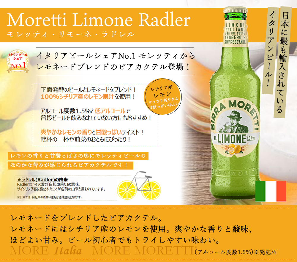 モレッティビールの最初のボトルは1860年の夏に発売を開始しました。その当時とはボトルのサイズ等は多少異なりますが、産み出されるその味わいは発売された当初と少しも変わっていません。マシンを取り入れたオペレーションは当時としては非常に先進的であると大変評価され、今日に至るまでも同じように最先端のマシンオペレーションで時代をリードし続けています。1990年代に入り、発売当初から150年たった今、モレッティビールはフリウリ州を代表するビールというよりも、イタリアを代表するビールへと変貌を遂げ、新たなファンを獲得し続けています。