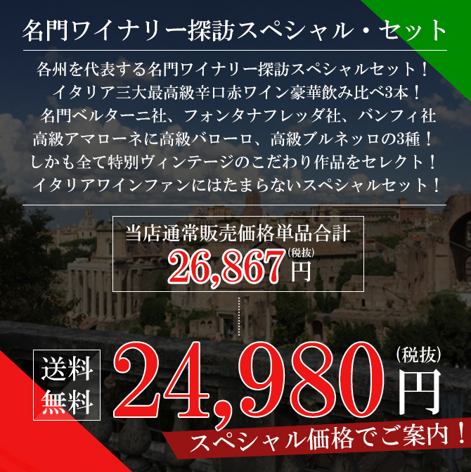 ■商品説明高級イタリアワイン愛好家垂涎!各州を代表する名門ワイナリー探訪スペシャルセット!高級イタリア三大赤ワインセット!イタリアワイン大好きなあなたへ!高級アマローネに高級バローロ、高級ブルネッロ・ディ・モンタルチーノこだわり最高級の贅沢な辛口赤ワイン3本セット!いずれもワイナリー・オブ・ザ・イヤーに輝いた名門ベルターニ社、名門フォンタナフレッダ社、名門バンフィ社の渾身辛口赤ワインをセレクト!あの『神の雫』にも登場の名門ベルターニ社の高級アマローネ!あのジョニー・○ップもこのベルターニのオールドヴィンテージ・アマローネの大ファンで有名!遅摘みしたコルヴィーナ種とロンディネッラ種のブドウを、屋根裏部屋の自然な環境の中で3ヶ月にわたり陰干し、その後6年間という長い間をオーク樽で熟成!さらに12ヶ月の瓶内熟成!ほぼ8年の時を経てリリースされる究極アマローネ・デッラ・ヴァルポリチェッラ・クラッシコ(辛口)!深く濃いガーネット色!独特な熟したマラスカ(ヴァニラ・リキュール)やチェリー・リキュールの香りに、さらにビターアーモンドやバラの花、クルミの芳醇な香り!長い熟成から醸し出された重厚な味わい!がアマローネファンの思いを見事につかんでくれます!しかもマスター・オブ・ワインである天才醸造家アンドレア氏が醸造に携わった希少[2012]年もの(ジェームス・サックリング98点&フォルスタッフ誌96点&ワインエンスージアスト誌95点)が1本!さらにブルネッロ・ディ・モンタルチーノの代表格ワイナリー“バンフィ社”の渾身ブルネッロ・ディ・モンタルチーノ!しかもバンフィー社のオーナー曰く「2016年のセラー在庫は世界各国で大好評でもうすでに全て完売しています。この特別ヴィンテージ2016年のブルネッロは凄い完成度で、今後、幻のヴィンテージとなりますよ。」と自信満々に断言していた偉大な最高級ブルネッロ[2016]年(ワインアドヴォケイト誌94点&ジェームス・サックリング95点&ワインスペクテーター誌92点)エーテルの香りとわずかにバニラを思わせるソフトで凝縮感があり、しかもビロードのような舌触りを持つ、ブルネッロファン垂涎の逸品が1本!さらにワイン・エンスージアスト誌のワインスター・アワード2017で、名門フォンタナフレッダがヨーロピアン・ワイナリー・オブ・ザ・イヤーに選ばれました!19世紀末にイタリアの初代国王、ヴィットリオ・エマニュエーレ2世の息子が、その所有地を譲り受け、設立したワイナリー!一世紀以上(155年以上)にわたりバローロを造り続け、伝統的なバローロ造りのリーダー的存在!フォンタナフレッダ社の看板バローロ!昨今の凝縮感ばかりの主張の強いバローロとは少々趣の異なる老舗ならではの奥ゆかしい味わい!大樽熟成らしいおおらかさと、慎ましやかな印象を兼ね備えた究極バローロ(デカンタ誌驚異95点&ジェームス・サックリング91点高評価!)が1本!の名門ワイナリー探訪スペシャルワイン3本セット!名門生産者の高級アマローネに高級バローロ、高級ブルネッロ・ディ・モンタルチーノ、イタリア三大最高級辛口赤ワイン豪華飲み比べ3本セット!これを飲めばイタリアの偉大赤ワインが理解できる!イタリアワインファンにはたまらないスペシャルセット!当店通常販売価格単品合計で26,867円(税抜)のところスペシャル価格24,980円(税抜)でご案内!しかも送料は当店が負担いたします!