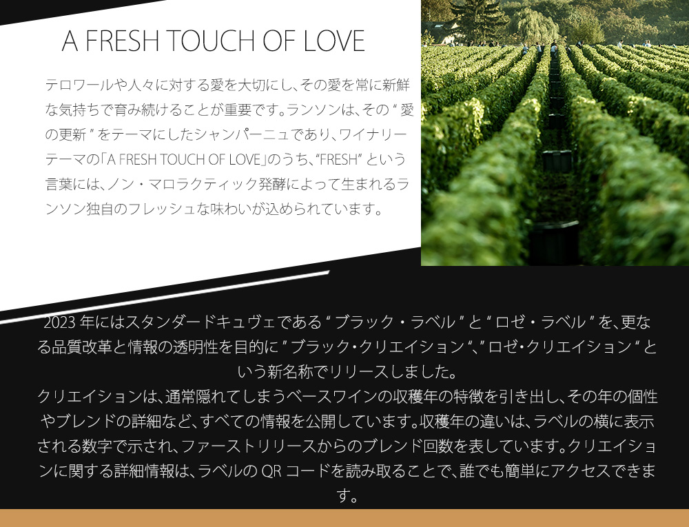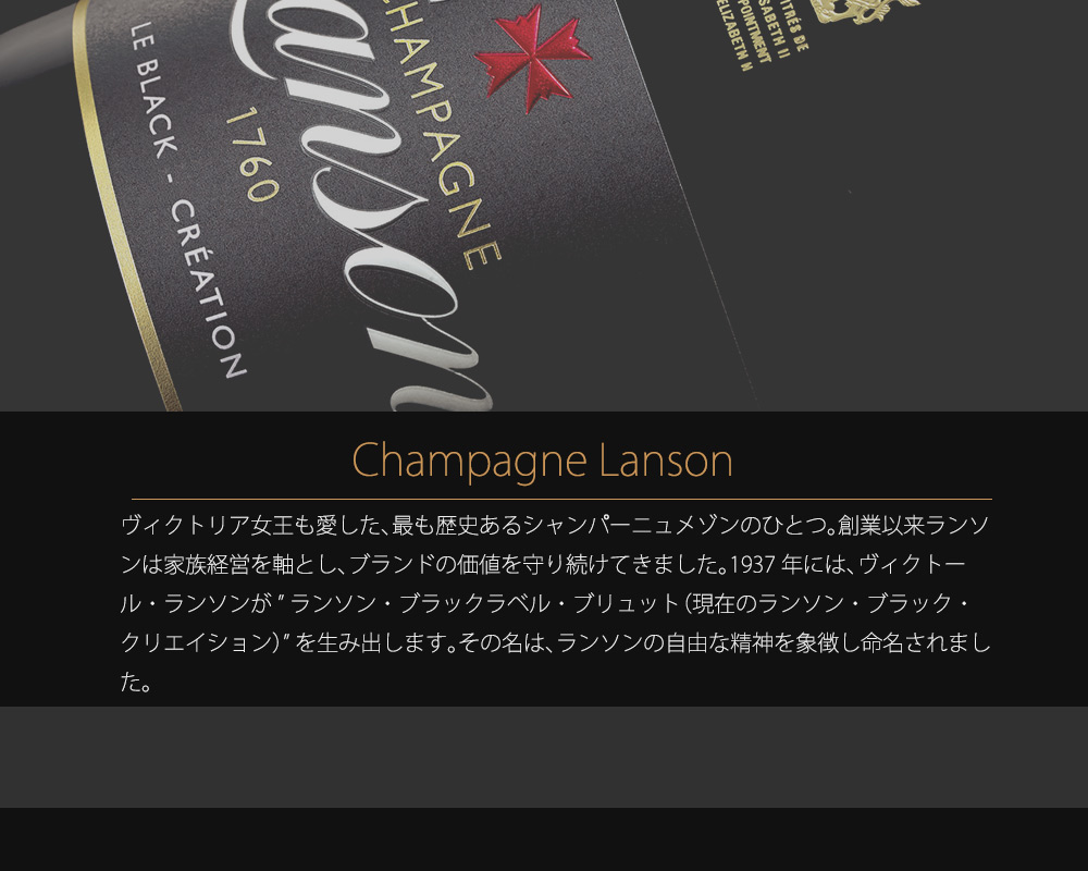 大人気シャンパーニュ愛好家大注目!あの名門中の名門!英国王室御用達!の名門ランソン社の逸品!あまりに有名!キリッと引き締まったエレガントな辛口!大人気ブラック・ラベルが「ランソン・ブラック・クリエイション・ブリュット」に名称変更され遂に正規品で登場!一世紀以上もの間、英国王室御用達のシャンパーニュとして王室に愛され続け、また、ウィンブルドン・テニストーナメントの公式シャンパーニュとしても長年にわたり選ばれ続けています!「1760年に創業された最も歴史のあるシャンパーニュ・メゾンの一つ。伝統と独自の専門知識、そしてシャンパーニュ造りへの深い愛情を持ち、最高品質のシャンパーニュの製造に情熱を注いできました。その卓越した品質は世界中のワイン愛好家や専門家から高く評価されています。英国王室御用達のシャンパーニュとして一世紀以上も愛され続けており、ボトルにはその証である英国王室の紋章が刻まれています。王室公式シャンパーニュの栄誉を授与して以来、その称号を一度も失っていない唯一のメゾン。ランソンでは、ノン・マロラクティック醗酵を採用することで、爽やかな酸味とフレッシュでクリーンな口当たりを実現。この製法がランソンのシャンパーニュを特徴づけています。シャンパーニュ・ランソンのテーマは「A FRESH TOUCH OF LOVE」。ランソンでは、テロワールや人に対する「愛」を持ち続けることを大切にしています。愛は当たり前のものではない、というのがランソンの考えです。愛を持ち続けるためには、常に新鮮(FRESH)な気持ちで愛を更新することが必要だとの思いでワイン造りを行っています。ランソンの特徴であるノン・マロラクティック製法によるフレッシュな味わいは、ランソンの考える「A FRESH TOUCH OF LOVE」そのものです。最高醸造責任者のエルヴェ・ダンタン氏は、シャンパーニュ地方マルヌ村にワイン生産者の息子として生まれました。ボルドー、アルザス、ブルゴーニュやアメリカで経験を重ねた後、わずか25歳でシャンパーニュのワインメーカーに抜擢。シャンパーニュ・メゾンで22年間にわたってワイン造りの経験を積み、2013年にランソンに最高醸造責任者として加入しました。55ものクリュ別タンクの導入やスタンダード・キュヴェの一新など、ダンタン氏はその情熱と創造性をもって、ランソンに数々の革新をもたらしています。」ランソンはシャンパーニュにおける情報の透明性のパイオニアです!2009年には他メゾンに先駆けてデゴルジュマン日を裏ラベルに記載!2023年には情報の透明性を体現する取り組みの一つとして“クリエイション・シリーズ” を開始!スタンダードキュヴェにもQRコードを通じて収穫年の情報や産地情報など非常に細かい情報を提供しています!この「ランソン・ブラック・クリエイション・ブリュット」は、白亜質土壌からのピノ・ノワール50%、シャルドネ35%、ピノ・ムニエ15%(特級&1級畑比率50%以上)を最低でも驚異の4年以上の熟成!しかも創業の1760年から数えて、「258回目の収穫年(=2018年)をベースワインとして使用!しかもパーペチュアル・リザーヴを全体の32%使用の贅沢仕様!デゴルジュ後さらに6ヶ月間セラーで熟成でリリース!(クリエイションは、通常隠れてしまうベースワインの収穫年の特徴を引き出し、その年の個性やブレンドの詳細など、すべての情報を公開しています。収穫年の違いは、ラベルの横に表示される数字で示され、ファーストリリースからのブレンド回数を表しています。クリエイションに関する詳細情報は、ラベルのQRコードを読み取ることで、誰でも簡単にアクセスできます。)しかも新鮮さを残すためあえてマロラクティック醗酵を行わないことで有名!しかもドサージュ9g/Lの本格派!生き生きとした春に咲く花やシトラス、マンダリンのアロマにトーストのニュアンス!様々な花の蜜の香りとスパイスの長い余韻!世界のワインライター絶賛の気品あふれるエレガントな味わい!新しく生まれ変わったランソン・ブラック・クリエイション・ブリュット!超極上辛口シャンパーニュが正規品で待望入荷!シャンパーニュ愛好家の方はお急ぎ下さい。