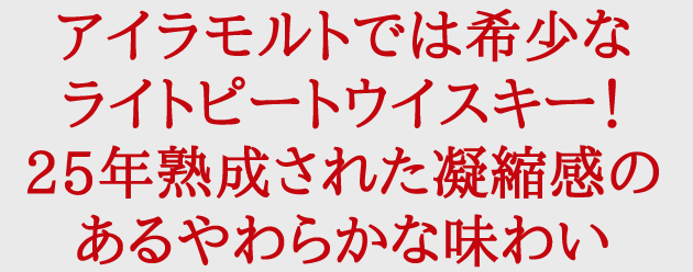 アイラモルトでは希少なライトピートウイスキーで25年熟成された凝縮感のあるやわらかな味わいが特徴です。冷却ろ過を行わない、ナチュラルカラー、アルコール度数を46度に変更し、より原酒本来の味を強調しております。