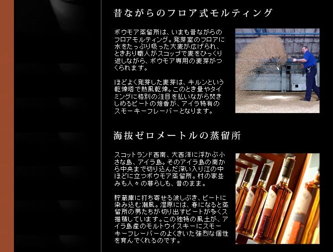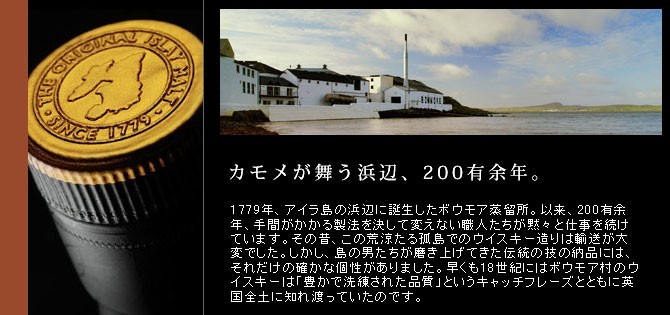 スコットランド西南、大西洋に浮かぶ小さな島、アイラ島。そのアイラ島の南から中央まで切り込んだ深い入り江の中ほどに立つボウモア蒸留所。村の家並みも人々の暮らしも、昔のまま。貯蔵庫に打ち寄せる波しぶき、ピートに染み込む潮風。湿原には、春になると蒸留所の男たちが切り出すピートが多く推積しています。この独特の風土が、アイラ島産のモルトウイスキーにスモーキーフレーバーのよくきいた強烈な個性を育んでくれるのです。