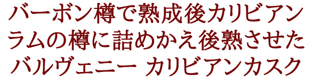 ザ・バルヴェニー 14年 カリビアンカスク バーボン樽で熟成後、カリビアンラムの樽に詰めかえ後熟。トロピカルフルーツのようなまろやかなコク。深い金色。クリーミーなトフィー・フルーティな熟成香。バニラ、トロピカルフルーツの味わい。温かみのある、まろやかな余韻が長くつづきます。