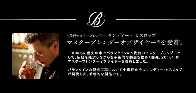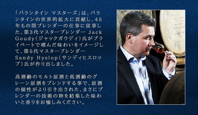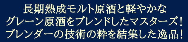 バランタイン マスターズは、長期熟成モルト原酒と軽やかなグレーン原酒をブレンドすることで、オレンジや梨のように甘くフルーティーな香味と滑らかな口当たりを実現する、まさにブレンダーの技術の粋を結集した逸品です。 バランタインを構成するキーモルトである「グレンバーギー」がシトラスやオレンジのようなフルーティな香りを、「ミルトンダフ」が芳醇でクリーミーな味わいを醸成しています。