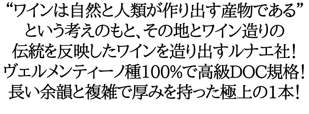 “エチケッタ・ネーラ”コッリ・ディ・ルーニ・ヴェルメンティーノ 2021年 そのシーズンで最良の畑で収穫したブドウを社長自ら厳選して造る大人気ワイン。野生の花やハーブ、スパイス、熟したフルーツ、ハチミツなどの濃厚でありながらもエレガントなブーケ。バランスがとれミネラルを感じさせる長い余韻と、複雑で厚みを持った味わい。 ルナエ社の周辺は、海と山に挟まれた土地で、夏場でも夜は冷え込みます。そのためこの寒暖の差が、たっぷりのアロマとフレッシュさを持ち合わせた辛口白ワインを生み出します。 この高評価の2021年のエチケッタ・ネーラも野生の花やハーブ、スパイス、熟したフルーツ、ハチミツなどの濃厚でありながらもエレガントなブーケ!バランスがとれミネラルを感じさせる長い余韻と複雑で厚みを持った味わいのワインに仕上がった究極辛口白ワイン!