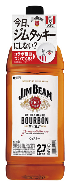 【正規品 2700ml KFCコラボ小皿付】ジムビーム バーボン 2700ml(2.7L) ケンタッキーフライドチキンコラボ小皿付き ウイスキー ケンタッキー ジェームズ ビーム 40% ■アルコール度数:40% ■内容量(1本あたり):2700ml(2.7L) 超限定!!バーボン愛好家必見!!世界No.1のバーボン!!バーボン中興の祖、4代目ジェームズ・ビームの愛称を冠したジムビーム!!世界120ヶ国以上の酒場で愛され、1973年より販売数量世界No.1をつづける、他ブランドを寄せ付けないザ・バーボン!!法定の2年を超える4年以上のホワイトオーク樽熟成!!バニラやキャラメルといったコーン由来の甘みが印象的な、バランスのとれた心地よい飲み口の大人気バーボン!!オレンジがかった琥珀カラー!!バニラ、キャラメル、コーンの香ばしさのアロマ!!甘く軽やかなキャラメルやバニラ、ほのかな樽のニュアンスの味わい!!クリーンで穏やかでキレのよい後味の大人気バーボンの2.7Lサイズ!!にさらにケンタッキーフライドチキンコラボ小皿がついて限定販売!!