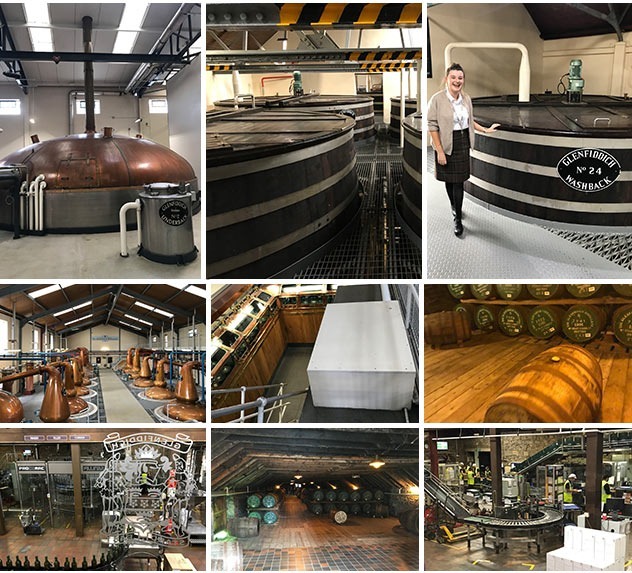 【理想のウイスキーづくり、シャトーモルト】華やかでライトな味わいのシングルモルト“グレンフィディック”は、初溜釜が4.6キロリットル、再溜釜が9.1キロリットルと手間も暇もかかる小さな直火型ポットスチルを採用。年季を積んだスチルマンの技で丁寧に蒸留しています。熟成樽はバーボン樽やシェリー樽を基本に樽材の種類や使用回数、内面処理の違いを駆使し、さまざまな味わいのモルト原酒に分類します。蒸留・貯蔵・瓶詰めをすべて蒸留所内で行うためシャトーモルトと呼ばれ、この理想のウイスキーづくりから、現在180ヵ国に輸出されているシングルモルトは生まれています。