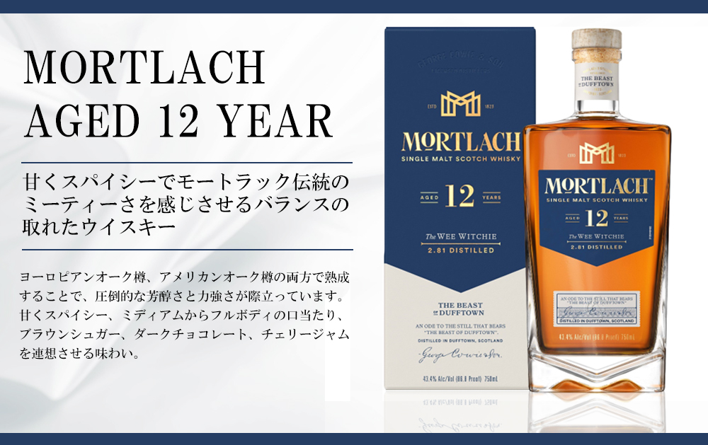 そんなモートラック蒸留所の12年熟成品!!ヨーロピアンオーク樽、アメリカンオーク樽の両方で熟成することで、圧倒的な芳醇さと力強さが際立っています!!