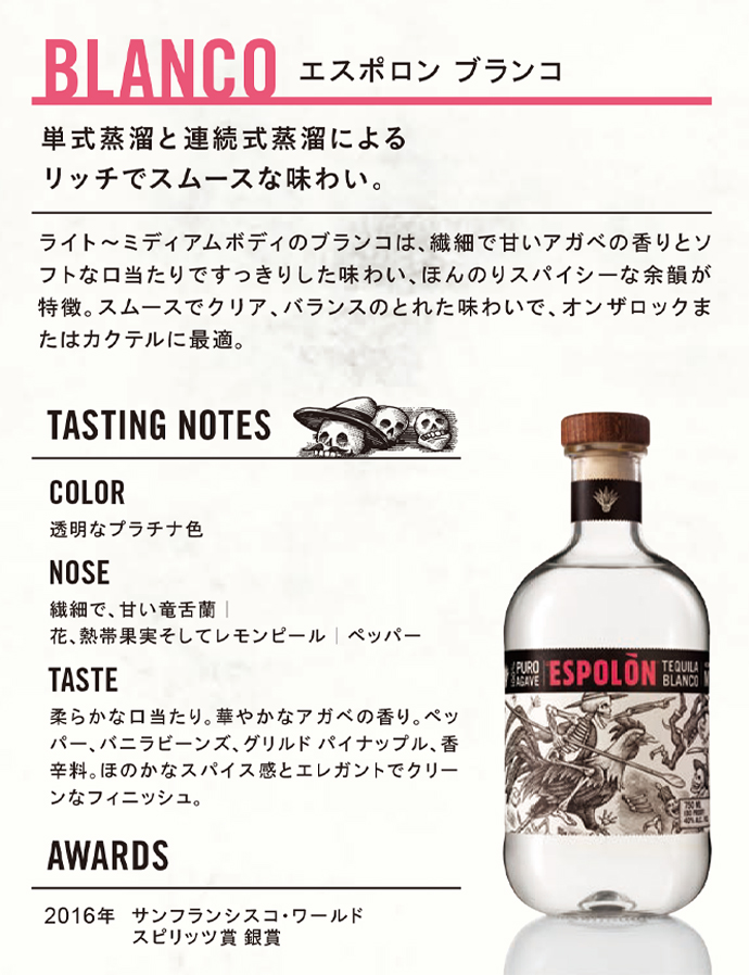 ライト~ミディアムボディのブランコは、繊細で甘いアガベの香りとソフトな口当たりですっきりした味わい、ほんのりスパイシーな余韻が特徴!!