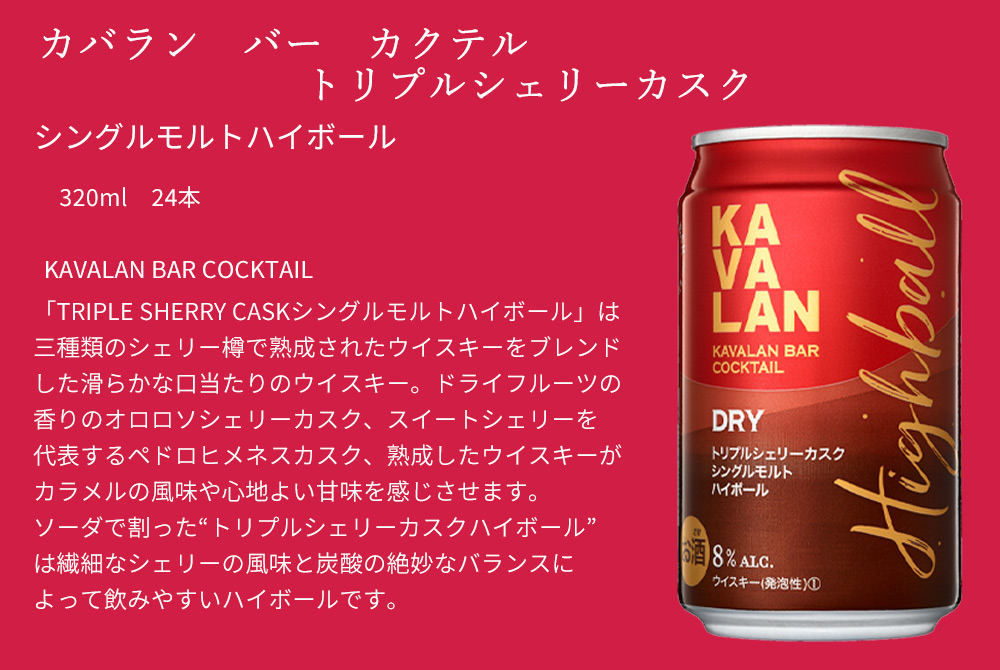 ハイボール缶カバランバーカクテル トリプルシェリーカスク シングルモルトハイボール(KAVALAN BAR COCKTAIL TRIPLE SHERRY CASK SINGLEMALT HIGH BALL)!!三種類のシェリー樽で熟成されたウイスキーをブレンドしたトリプルシェリーカスクは、ブレンダーの技術により調和し滑らかな口当たりのウイスキー!!完熟したドライフルーツの香りのオロロソシェリーカスク、スイートシェリーを代表するペドロヒメネスカスク、そしてモスカテルカスクで熟成したウイスキーがカラメルの風味や心地よい甘味を感じさせます!!ソーダで割った”トリプルシェリーカスクハイボール”は繊細なシェリーの風味と炭酸の絶妙なバランスによって飲みやすいハイボールです!!