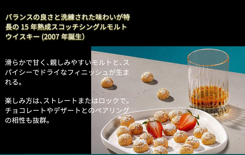 滑らかで甘く、親しみやすいモルトと、スパイシーでドライなフィニッシュのシングルモルト!!ストレートまたはロックでお楽しみいただくのがおすすめです!!チョコレートやデザートとのペアリングの相性も抜群です!!