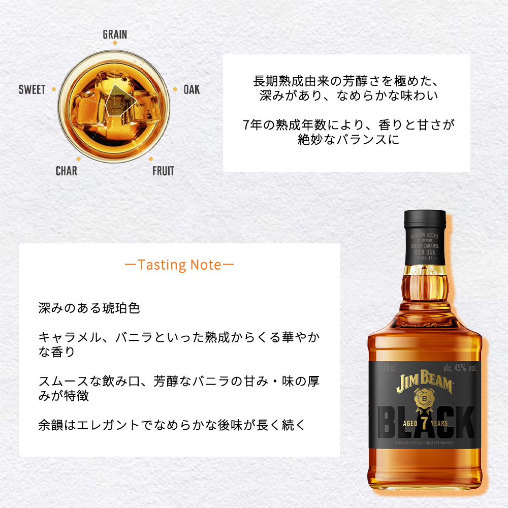 | ■商品説明 | バーボンウイスキー愛好家必見!!世界No.1のバーボン!!バーボン中興の祖、4代目ジェームズ・ビームの愛称を冠したジムビーム!!世界120ヶ国以上の酒場で愛され、1973年より販売数量世界No,1をつづける、他ブランドを寄せ付けないザ・バーボン!!ジムビーム!!より熟成年数7年以上の原酒を使用した、リッチな味わいのバーボンウイスキー!!ジムビーム ブラック 7年!!入荷!!深みのある琥珀色!!キャラメル、バニラといった熟成からくる華やかな香り!!スムースな飲み口、芳醇なバニラの甘み・味の厚みが特徴!!余韻はエレガントでなめらかな後味が長く続く!!7年熟成由来の芳醇さを極めたなめらかな味わいのバーボンウイスキー!! |