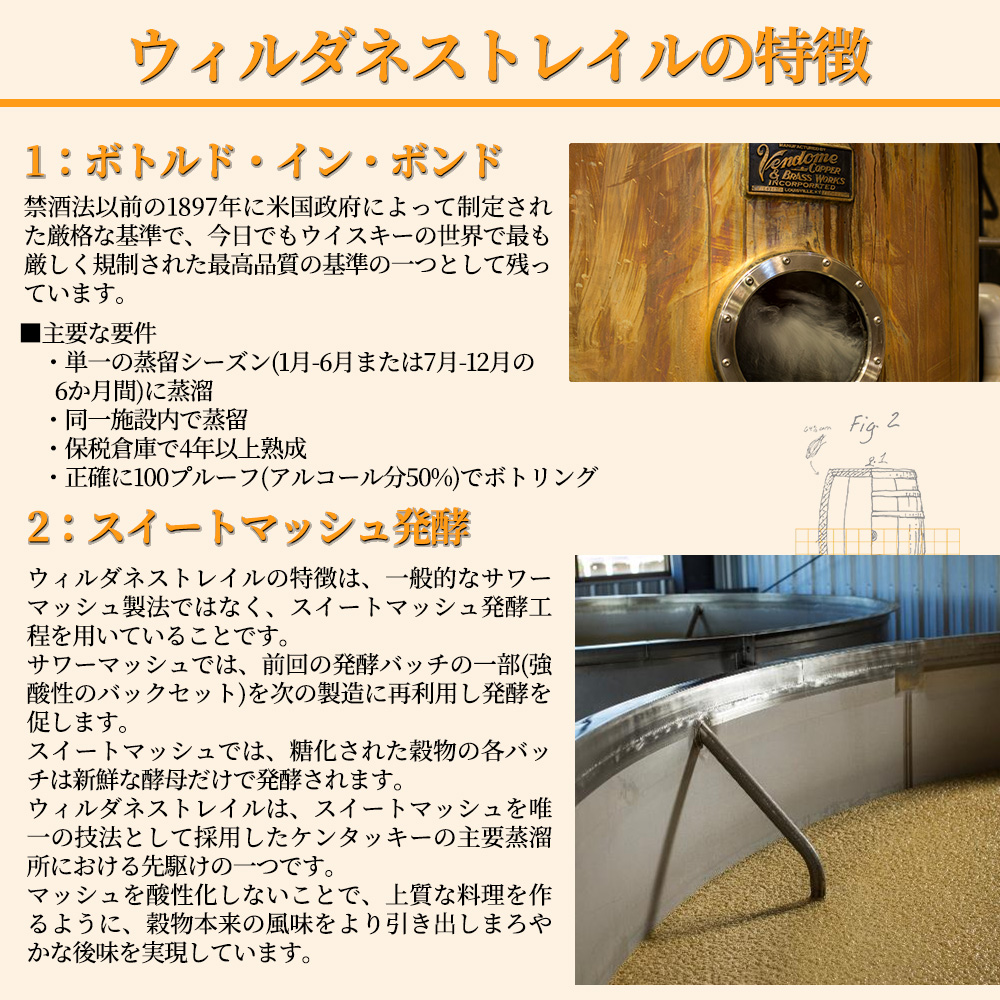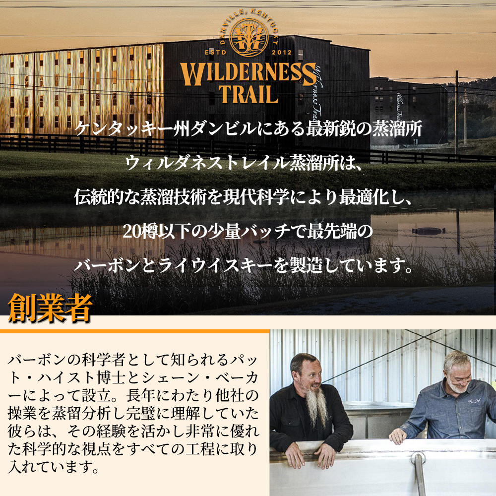 | ■商品説明 | ケンタッキー州ダンビルにある最新鋭の蒸溜所!!伝統的な蒸溜技術を現代科学により最適化し、20樽以下の少量バッチで最先端のバーボンとライウイスキーを製造している2012年創業!!ウィルダネストレイル蒸溜所!! バーボンの科学者として知られるパット・ハイスト博士とシェーン・ベーカーによって設立!!長年にわたり他社の操業を蒸留分析し完璧に理解していた彼らは、その経験を活かし非常に優れた科学的な視点をすべての工程に取り入れています!! ウィルダネストレイル ハイライ・バーボンはアメリカンウイスキーの可能性を追求し続けるというコミットメントの一環としてフラッグシップのウィーテッド・バーボン(ライ麦を全く含まない)とはまったく異なるフレーバープロファイルを持つバーボンを作りたいと考え生み出されました!! 小麦をライ麦に置き換えることで、ウィルダネストレイル ハイライ・バーボンは際立ったスパイシーな風味が特徴!!ケンタッキーバーボンにおいて最も高い割合でライ麦を使用し、スパイシーなプロファイルとなっている!! |