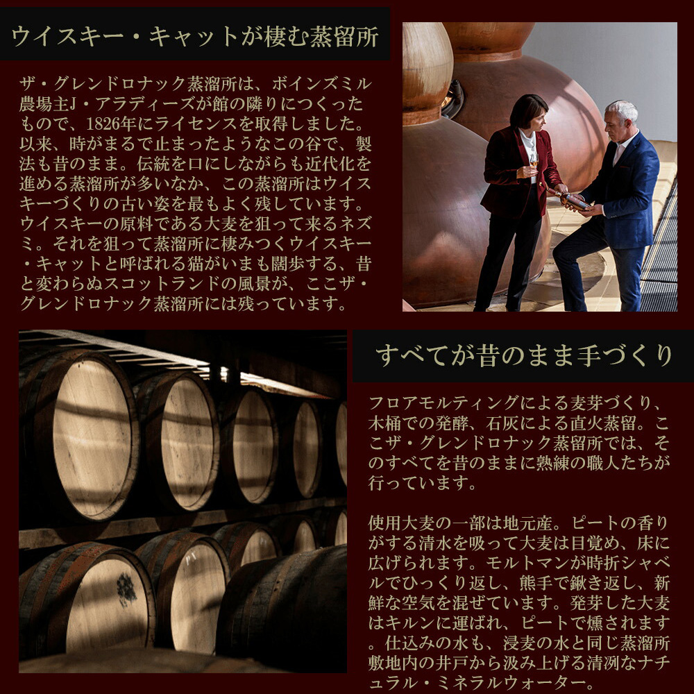 | ■商品説明 | 1826年創業!歴史あるシェリー樽熟成シングルモルトウイスキーブランドとして大人気!!グレンドロナック蒸留所!!ゲール語で“黒いちごの谷”という意味を持つグレンドロナック蒸留所からオロロソ シェリー樽、ペドロヒメネス シェリー樽と2種類のシェリー樽を使用して作り上げられた甘みが見事に調和した究極シングルモルト!グレンドロナック21年もの!!超限定入荷!! チェリーウッドの光沢を持つ深い琥珀色!!ブラックベリー、レッドプラム、リッチなオロロソシェリーと砂糖漬けのオレンジ 、トーストしたオークの香り!!口に含むと芳醇な風味が口全体を優しく包み込み、上質なシェリーとビターチョコレート、ナツメグやジンジャーのスパイシーな味わい!!厳選されたオロロソシェリー樽の奥深いコクとペドロ・ヒメネス樽の甘みが、見事な調和を生み出しています!! その比類なき品質をさらに引き立てる、高級感あふれるギフト箱入りなのでスコッチ愛好家への贈り物にも最適です!! |