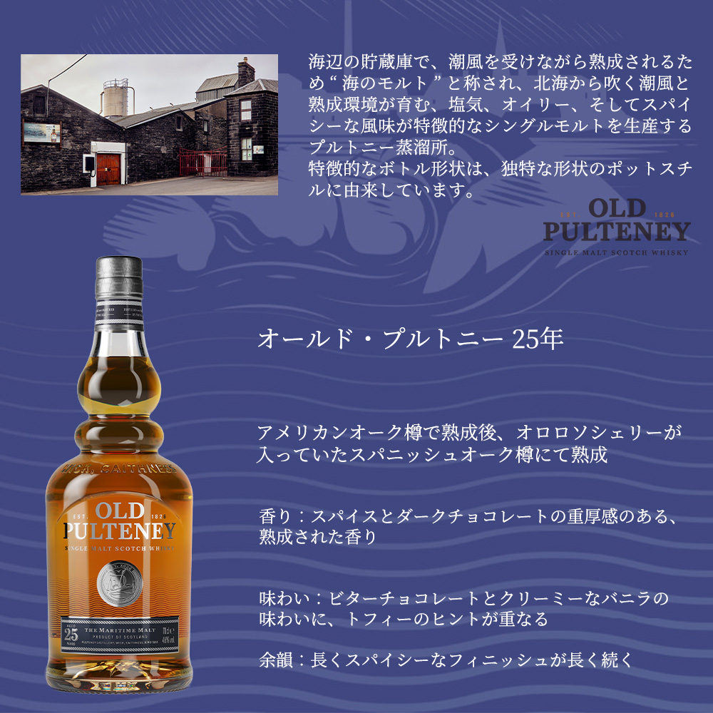 | ■商品説明 | 1826年スコットランド北部ハイランドの港町ウィックに創業した、最も古い蒸溜所の1つ!!プルトニー蒸溜所!!最北端に近い蒸留所でかつてニシン漁で栄えた町で、現在も海の文化が根付いています!!海辺の貯蔵庫で、潮風を受けながら熟成されるため“海のモルト”と称され、北海から吹く潮風と熟成環境が育む、塩気、オイリー、そしてスパイシーな風味が特徴的なシングルモルトを生産しています!!特徴的なボトル形状は、独特な形状のポットスチルに由来しています!!シングルモルト オールドプルトニー 25年!!はアメリカンオーク樽で熟成後、オロロソシェリーが入っていたスパニッシュオーク樽にて熟成!!スパイスとダークチョコレートの重厚感のある、熟成された香り!!ビターチョコレートとクリーミーなバニラの味わいに、トフィーのヒントが重なる!!長くスパイシーなフィニッシュが長く続く長期熟成品!! |